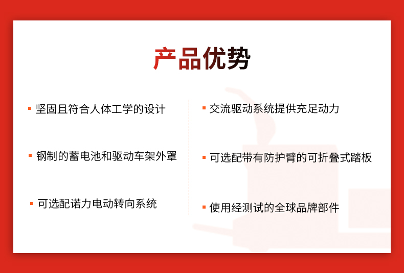 主要特點 ·交流驅(qū)動系統(tǒng)。 ·具有CAN-BUS總線技術(shù)且符合人體工學(xué)的手柄。 ·鑰匙開關(guān),急停開關(guān)和蓄電池電量表。 ·鋼制蓄電池和驅(qū)動車架外罩。 ·可選配典型美式帶短貨叉頭的貨叉架。 ·可選配帶有防護臂的懸浮可折疊式踏板。