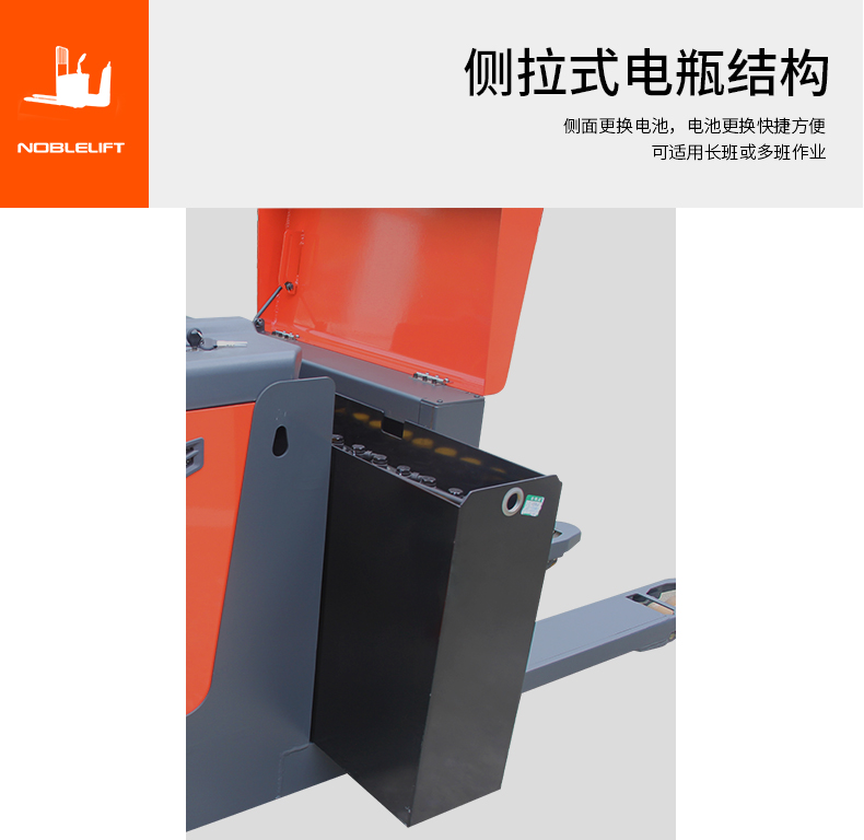 ? 側拉式電瓶結構,電瓶更換更方便快捷,可適用長班或多班作業(yè)。