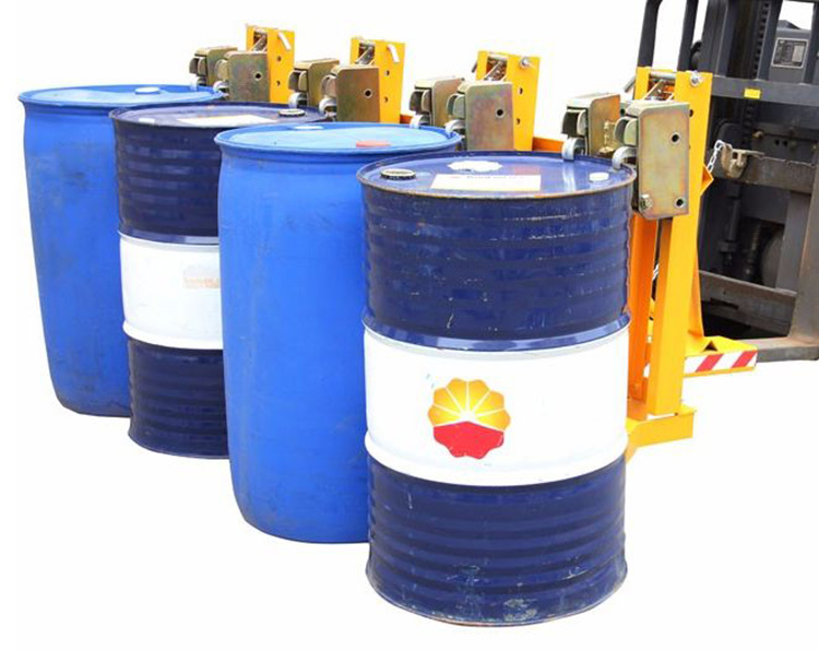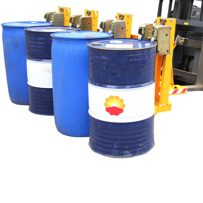 ? 純機械結(jié)構(gòu)設(shè)計的輕型雙鷹嘴四油桶夾具可與叉車方便地配合,僅依靠叉車的