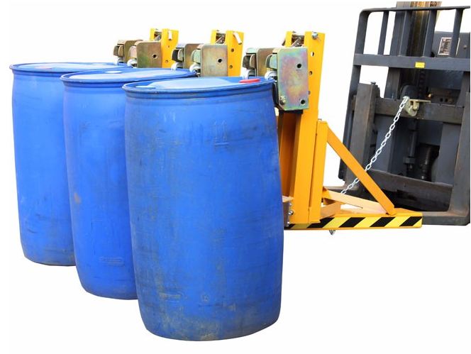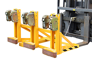 ? 純機(jī)械結(jié)構(gòu)設(shè)計的重型三油桶夾具可與叉車方便地配合,僅依靠叉車的動作,不需要其它動力,可自動一次搬運1-3個桶。