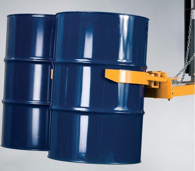 ? 叉車專用屬具,適用于55加侖鋼制油桶搬運、堆放。