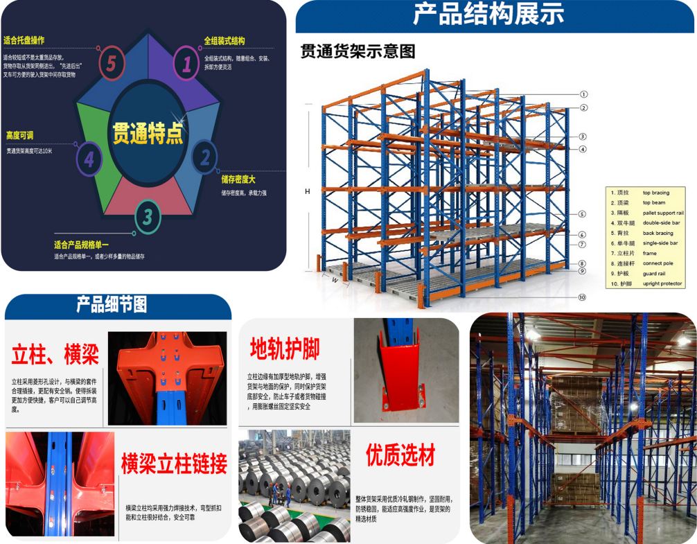 貫通式貨架又稱通廊式貨架或駛?cè)胧截浖?。貫通式貨架可供叉車(或帶貨叉的無人搬運車)駛?cè)胪ǖ来嫒∝浳?,適用于品種少,批量大類型的貨物儲存。貫通式貨架除了靠近通道的貨位,由于叉車需要進入貨架內(nèi)部存取貨物,通常單面取貨建議不超過7個貨位深度。為提高叉車運行速度,可根據(jù)實際需要選擇配置導(dǎo)向軌道,與貨位式貨架相比,貫通式貨架(駛?cè)胧截浖埽┑膸炜臻g利用率可提高30%以上,貫通式貨架(駛?cè)胧截浖埽V泛應(yīng)用于批發(fā)、冷庫及食品、煙草行業(yè)。