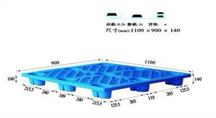 單面塑料托盤(pán)只能一面使用,表面有網(wǎng)格狀和平板狀兩種,底部有川字型、田字型、九腳型。