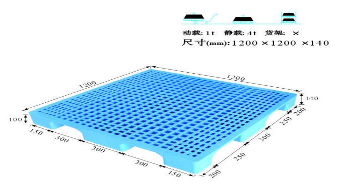 單面塑料托盤只能一面使用,表面有網格狀和平板狀兩種,底部有川字型、田字型、九腳型。