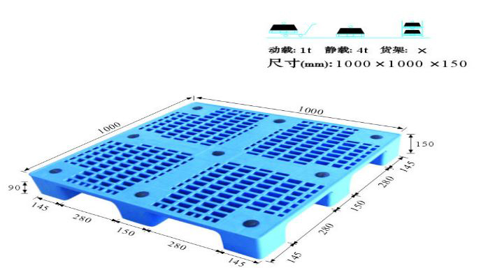 單面塑料托盤只能一面使用,表面有網(wǎng)格狀和平板狀兩種,底部有川字型、田字型、九腳型。