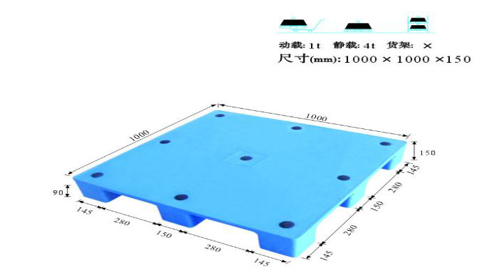 單面塑料托盤(pán)只能一面使用,表面有網(wǎng)格狀和平板狀兩種,底部有川字型、田字型、九腳型。